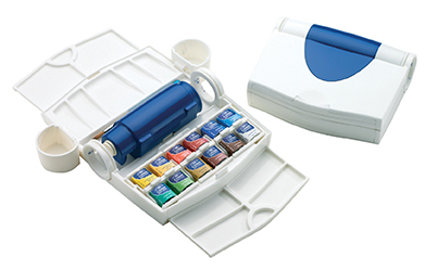 Constructed in durable plastic with thumb ring, the Field Plus opens to reveal 12 half pans of Cotman water colours, a Cotman Pocket Brush (No.5), Artists’ Sponge, 2 clip-on water pots and a 60ml capacity water bottle. It also offers 3 substantial mixing surfaces, one internal mixing palette with deep wells and two detachable sliding palettes with more shallow wells.