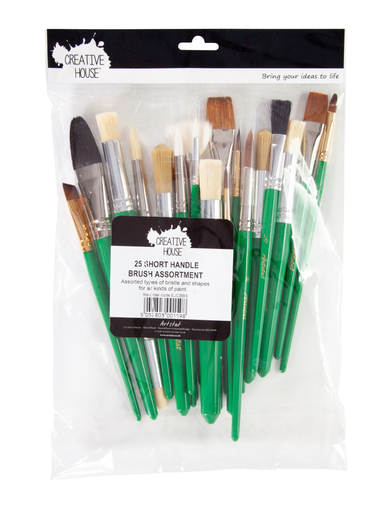 Assorted packs of 25 quality brushes.  A clear favourite with artists and crafters due to the varied bristle types and shapes.  Each pack includes at least one brush for every type of medium.