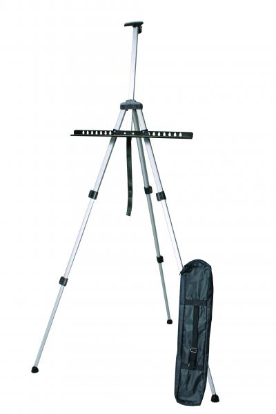 This is a aluminium folding easel with telescopic legs for extra stability. it can fold away for easy storage.